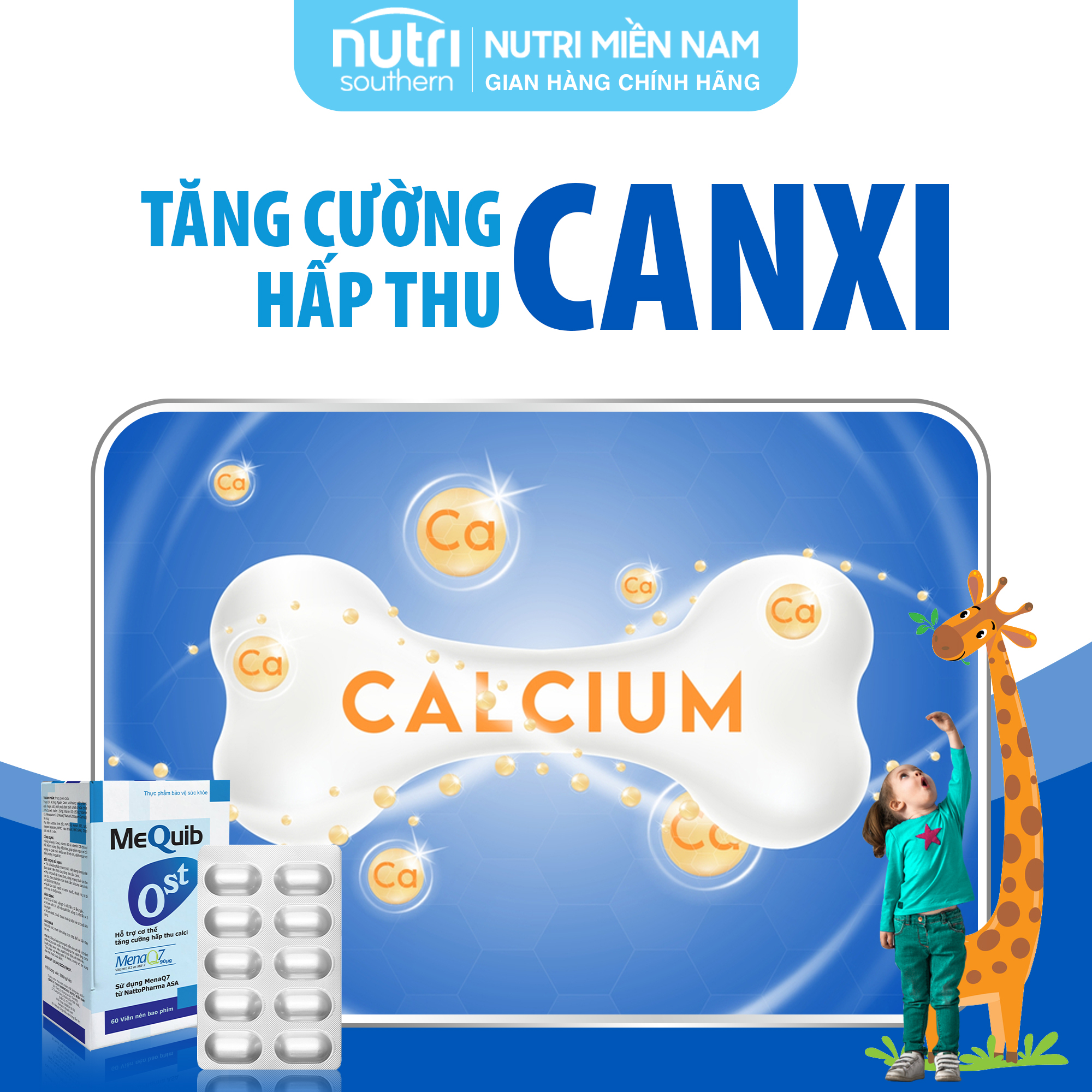 Vitamin D3K2 MK7 (MenaQ7) Và Canxi MEQUIB OST (Hộp 60 Viên) - Tăng Hấp Thu Canxi, Phát Triển Chiều Cao THÀNH PHẦN SẢN PHẨM: -Vitaminn K2 (Menaquinone-7 từ MenaQ7) 90mcg. -Vitamin D3 150IU. -Trucal D7 - Nguồn canxi và khoáng chất natri, kali, magie, sắt, phốt pho được tách chiết từ sữa (chứa 24% Canxi) 417mg. -Inulin 25mg.     CÔNG DỤNG SẢN PHẨM: -Giúp bổ sung canxi, Vitamin K2 và Vitamin D3 cho cơ thể. -Hỗ trợ xương răng chắc khỏe, giúp giảm nguy cơ còi xương và phát triển chiều cao ở trẻ em, giảm nguy cơ loãng xương ở người lớn.         ĐỐI TƯỢNG SỬ DỤNG: -Trẻ còi xương hoặc thanh thiếu niên đang trong giai đoạn phát triển chiều cao, tăng nhu cầu canxi. -Phụ nữ chuẩn bị mang thai, đang mang thai và cho con bú; đang tuổi tiền mãn kinh cần bổ sung canxi do chế độ ăn bị thiếu hụt. -Người cao tuổi, người hạ canxi huyết, chuột rút, tê bì chân tay do thiếu canxi.   HƯỚNG DẪN SỬ DỤNG: -Trẻ từ 2 đến 10 tuổi: Uống 1-2 viên/lần, ngày 2 lần. -Trẻ trên 10 tuổi và người lớn: Uống 2 viên/lần, ngày 2 lần. -Trẻ em dưới 2 tuổi tham khảo ý kiến bác sĩ trước khi dùng. -Thời gian sử dụng: Cùng bữa ăn, dùng hàng ngày ít nhất 3-6 tháng.