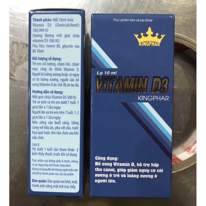 - ĐỐI TƯỢNG SỬ DỤNG Trẻ em thiếu vitamin D với các biểu hiện còi xương, đổ mồ hôi trộm, tóc rụng hình vành khăn, chậm mọc răng, chậm biết bò, đi. Tác dụng phụ của Vitamin - D3 Trẻ em còi xương, chậm lớn, chậm mọc răng do thiếu Vitamin D hoặc người bị loãng xương, có nguy cơ bị loãng xương, người cần bổ sung Vitamin D do chế độ ăn không đủ. * LƯU Ý : Sản phẩm này không phải là thuốcvà không có tác dụng thay thế thuốcchữabệnh. Bảo quản : Nơi khô ráo, thoáng mát, tránh ánh sáng. **XUẤT XỨ VÀ THƯƠNG NHÂN CHỊU TRÁCH NHIỆM VỀ CHẤT LƯỢNG HÀNG HÓA CÔNG TY CỔ PHẦN KINGPHAR VIỆT NAM Thôn Bình Phú, Xã Yên Phú, Huyện Yên Mỹ, Tỉnh Hưng Yên, Việt Nam Sản Xuất Tại : Công Ty TNHH SX Và TM Vinh Thịnh Vượng Thôn Bình Phú, Xã Yên Phú, Huyện Yên Mỹ, Tỉnh Hưng Yên, Việt Nam