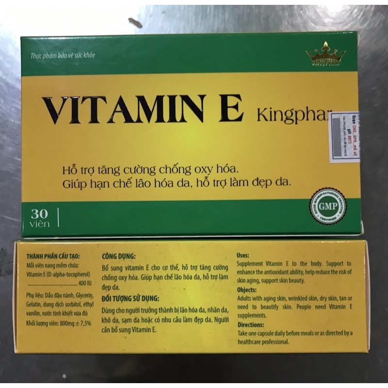 - CÔNG DỤNG Vitamin E Kingphar cung cấp vitamin E tự nhiên giúp chống oxy hóa, bảo vệ các tế bào bị tổn thương gây ra bởi quá trình oxy hóa của các gốc tự do. Hạn chế tình trạng lão hóa gây ra da nhăn, nám, sạm.