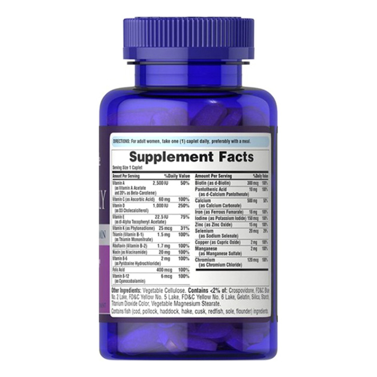 • Womens multivitamin one daily puritan pride lọ 100 viên giúp phụ nữ bổ sung lượng vitamin dồi dào hơn thực phẩm bình thường. Ngoài vitamin, sản phẩm còn cung cấp thêm các khoáng chất tốt cho hệ xương khớp, tim mạch, não bộ, tăng cường khả năng tiêu hóa.