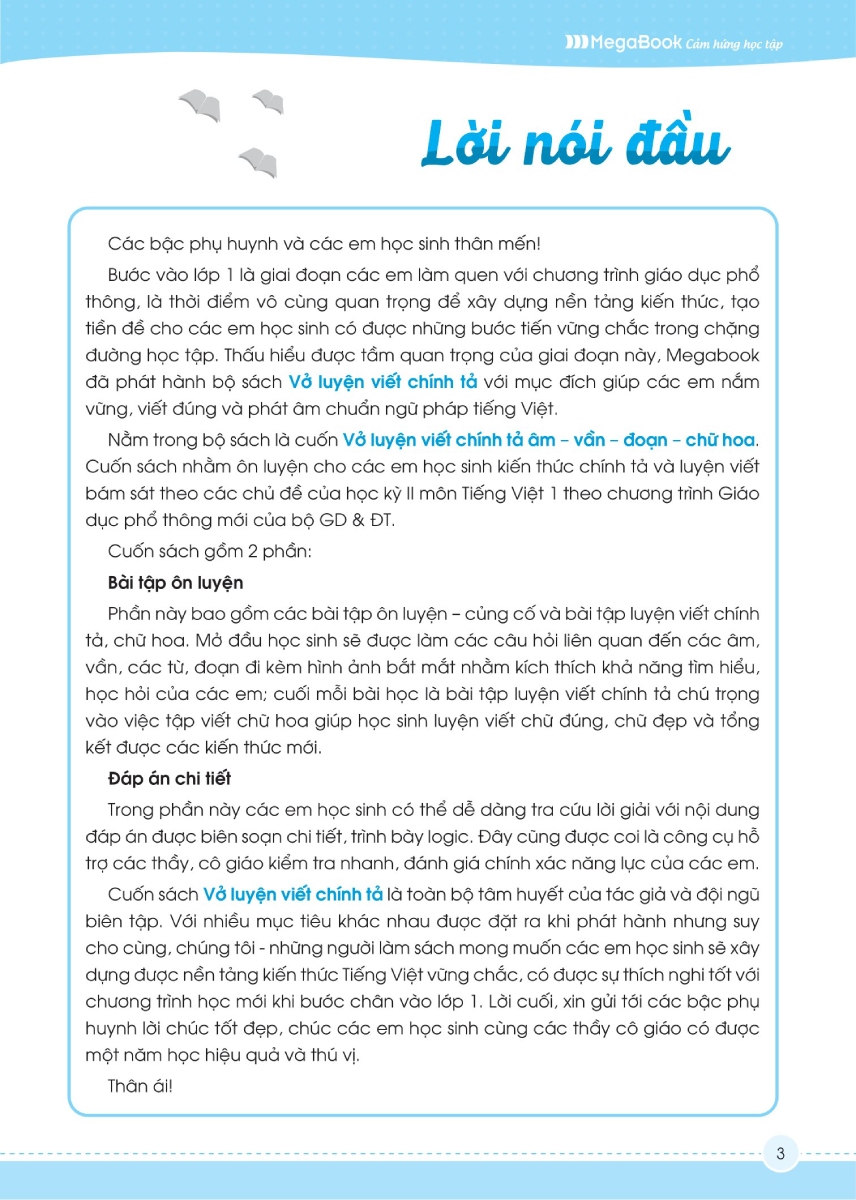 - Đáp án, lời giải chi tiết Phần lời giải giúp các em dễ dàng tra cứu với cách trình bày logic, chi tiết. Đồng thời giúp phụ huynh cũng như giáo viên có thể kiểm tra nhanh, đánh giá năng lực của các em Cuốn sách Vở luyện viết chính tả âm - vần - đoạn - chữ hoa không chỉ là một người bạn đồng hành cùng con trong những năm đầu đời lớp 1 mà còn là một nguồn tham khảo của giáo viên trong công tác giảng dạy và học tập.