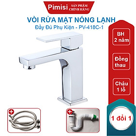 ✨Vòi Rửa Mặt Pimisi PV-418C-1 Thân Vuông Nóng Lạnh Cho Chậu Rửa Lavabo 1 Lỗ Âm - Dương Mặt Bàn Đá Làm Từ Đồng Thau Sáng Bóng - Chỉnh Nước Bằng Gật Gù Nóng Lạnh Trong Nhà Tắm Với Đủ Phụ Kiện Xi Phông Và Dây Cấp Nước | Chính Hãng