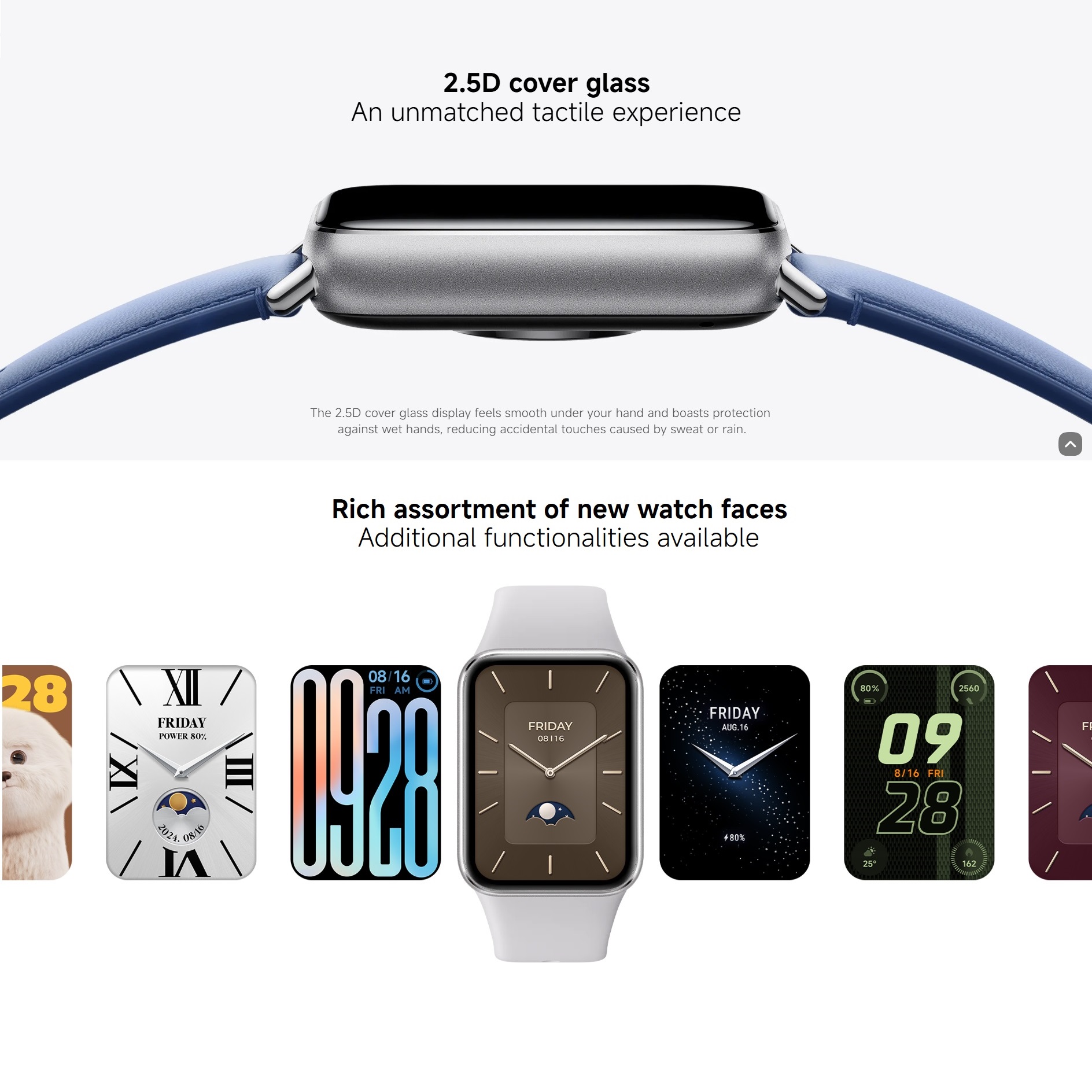 AMOLED 1,74 inch Màn hình hiển thị hình tứ giác có cạnh hẹp Được trang bị màn hình AMOLED hàng đầu trong ngành với công nghệ hút chân không, các cạnh hẹp được giảm xuống