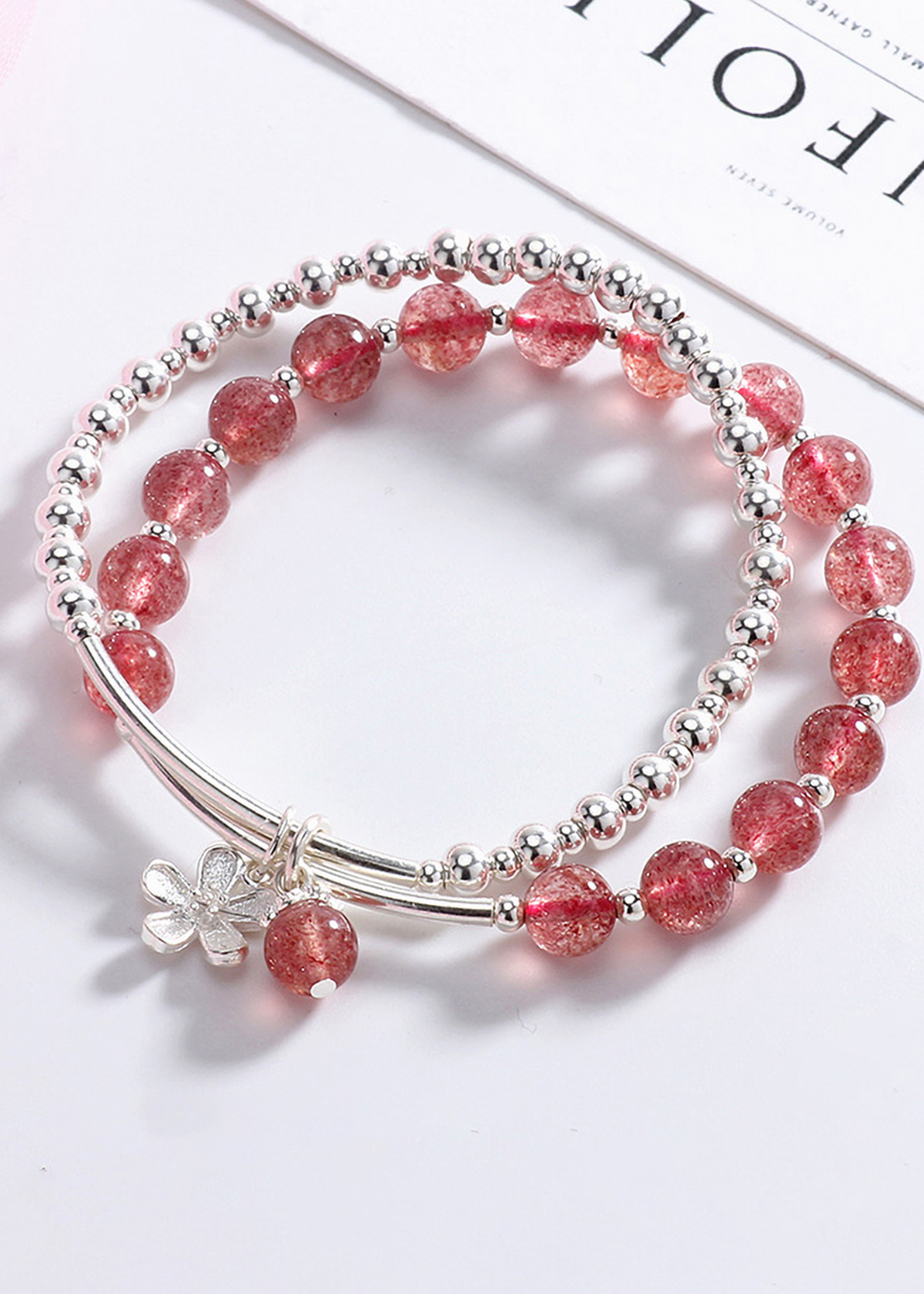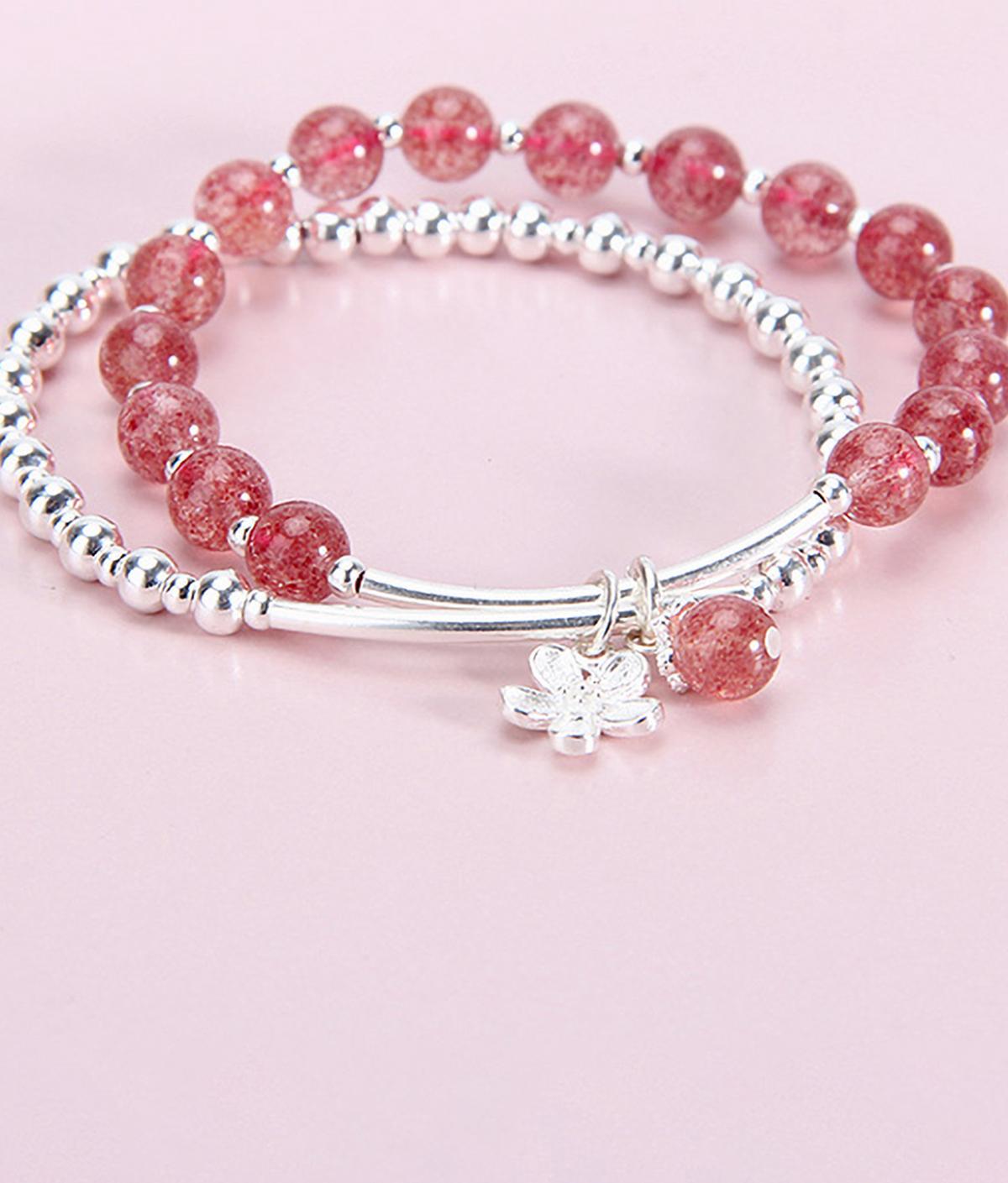 ✨Vòng tay 2 line đá thạch anh dâu phối charm hoa bạc mệnh hỏa, thổ - Ngọc Quý Gemstones