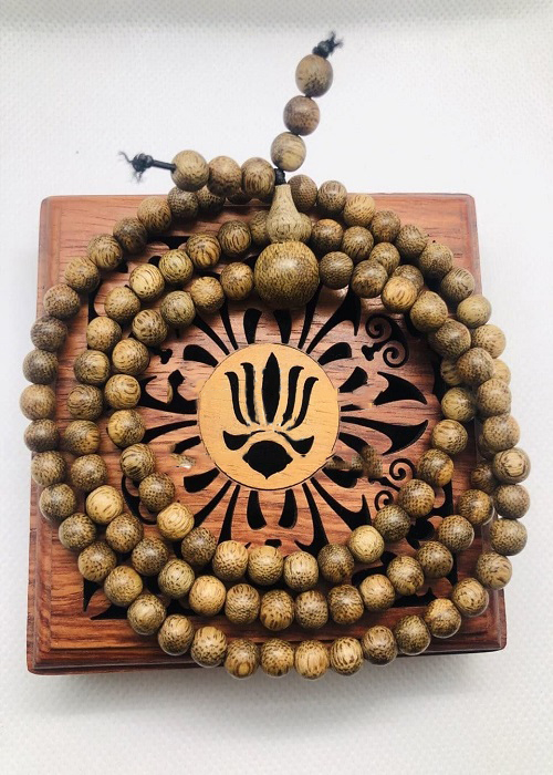 : Phật giáo nhìn vào vũ trụ nhân sinh, không phải là duy vật, không phải duy tâm, cũng không phải là duy thần. Mà Phật giáo nhìn vào sự hình thành của con người ở ba trạng thái kết hợp nhau là tâm, sinh và vật lý. Hay nói bằng danh từ Phật học là sự duyên hợp của ngũ uẩn, tứ đại; hoặc căn, trần và thức. Căn là nói về sinh lý, trần là vật lý, và thức là tâm lý. Căn, trần và thức tụ hội nhau để tồn tại. Nếu lìa một chỉ còn hai thì thế giới sẽ không tồn tại. Vậy căn, trần, thức là gì? Căn là: mắt, tai, mũi, lưỡi, thân và ý. Trần là: sắc, thanh, hương, vị, xúc và pháp. Thức là: nhãn thức, nhĩ thức, tỷ thức, thiệt thức, thân thức và ý thức. Từ nơi sáu căn tiếp xúc sáu trần sanh ra sáu thức. Thức tạo tác vọng động, tạo nghiệp hoặc thiện hoặc ác để trôi lăn trong sáu nẻo luân hồi. Ví dụ như mắt nhìn thấy sắc đẹp của một người liền khởi tâm say đắm, từ nơi đắm mê sắc đẹp mà tạo nên hành nghiệp. Cho đến tai nghe âm thanh, mũi ngửi mùi thơm, thân chạm xúc những chỗ trơn láng mềm mại, ý suy nghĩ ghét, thương, hận, thù… Lục căn là công cụ sai khiến của lục thức để tạo tác hành nghiệp thiện hoặc ác. Từ nơi hành nghiệp tích tụ chứa nhóm mang đi trong sáu nẻo luân hồi, từ quá khứ đến hiện tại, và, sẽ tiếp diễn trong tương lai; để chịu khổ trong vòng luân hồi. Quá khứ do sáu căn không thanh tịnh, chạy theo trần cảnh khởi lên đắm trước tạo nghiệp: tham, sân, si, mạn, nghi, ác kiến. Và trong đời vị lai ta lại cũng theo con đường cũ tạo nghiệp sanh tử tham, sân,… này mà đi. Từ nơi mắt thấy sắc tạo nên sáu món căn bản phiền não: tham, sân, si, mạn, nghi, ác kiến; cho đến mắt, tai, mũi, lưỡi, thân và ý, mỗi căn đều tạo nên sáu phiền não căn bản giống nhau: tham, sân, si, mạn, nghi, ác kiến. Mỗi căn chúng ta có sáu thứ căn bản phiền não, và; như vậy, sáu giác quan đã tạo nên 36 thứ phiền não trong đời sống thường ngày. Do đó, cuộc đời của chúng ta liên tục nối tiếp trong ba đời từ quá khứ đến hiện tại và tương lai. Như vậy, trong ba đời ta đã tạo thành 108 thứ phiền não để làm hành trang trong đoạn đường sanh tử không cùng tận. Cho nên, bây giờ chúng ta lần tràng hạt 108 lần trong khi niệm Phật, là quyết tâm đoạn trừ 108 món phiền não mà mình đã tạo trong ba đời. Đoạn trừ 108 món phiền não cũng có nghĩa là làm cho sáu căn thanh tịnh. Chuỗi tràng 108 hạt Sáu căn từ trước đến nay chạy theo sáu trần, khởi lên sáu món phiền não căn bản: tham, sân, si,…ây giờ ta lần tràng hạt niệm Phật, là ngăn cản không cho sáu căn vọng động chạy theo cảnh trần, và, giúp cho sáu căn quay về với tự tánh. Sáu căn cảm nhận sáu trần sanh ra sáu thức, thức vọng động tạo nghiệp luân lưu trong vòng sống chết. Lần tràng niệm Phật là không cho căn nhiễm với trần; căn không nhiễm trần tức căn thanh tịnh, căn đã tịnh thì nghiệp không còn, nghiệp đã dứt sanh tử đoạn diệt. Ấy gọi là giải thoát, hoặc vãng sanh về thế giới Cực Lạc của Phật A Di Đà. Theo Phật sử, Vua Ấn Độ Tỳ Lưu Ly thỉnh Đức Phật Thích Ca dạy cho pháp môn diệc trừ phiền não, Phật dạy nhà vua dùng hạt một loại cây gọi là “Vô Hoạn Tử” hay còn gọi là “Bồ Đề Tử” xâu thành chuỗi để niệm danh hiệu Phật thì sẽ tiêu trừ mọi phiền não. Trong Kinh Phật dạy: “Nếu như muốn tiêu trừ các phiền não chướng, nên xâu chuỗi 108, luôn đem theo bên mình, hoặc đi đứng nằm ngồi, lần chuỗi niệm Phật, niệm Pháp, niệm Tăng, lần chuỗi trì niệm danh hiệu Phật càng nhiều càng tốt. Nếu như mãn 20 vạn biến thì có thể đạt đến Thân Tâm Bất Loạn. Chuỗi còn là tín vật cho việc truyền thừa, kỷ vật. Vì vậy chuỗi tràng trong Phật Giáo ngoài công năng là pháp khí tu hành ra còn là bảo vật của Tam Bảo, tín vật của sự truyền Pháp và là pháp vật chứa đựng công đức, cũng như thần lực rất cao vì tích tụ sự tu trì, công đức của các bậc tu hành Vòng tay - chuỗi hạt trầm hương, không chỉ mang lại nhiều may mắn cho người mang mà còn có thể trừ tà, khử các khí độc không tốt ảnh hưởng đến sức khỏe. Và đặc biệt hơn đây là một vật phẩm rất có ý nghĩa trong phong thủy bởi vì trầm hương được biết tới nhiều nhất vì nó hút linh khí của trời và đất để tạo ra hương thơm tự nhiên.Vòng tay trầm hương là vật giúp cảm thấy bình an, nhắc nhở ta luôn từ bi hủy xã, kiềm chế nóng giận, bực tức. Mang lại may mắn, tài lộc cho gia chủ
