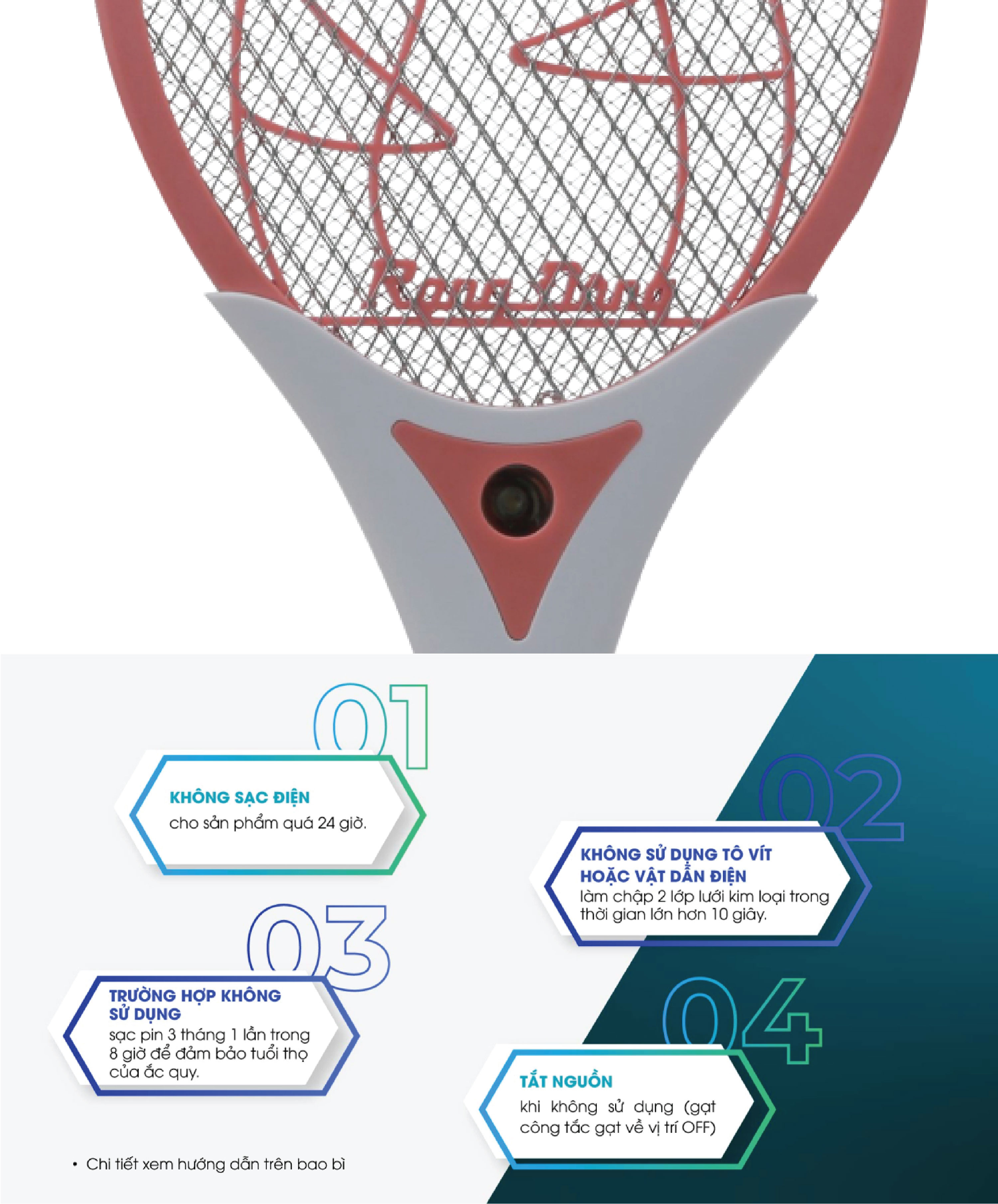 - Điện áp nguồn sạc: (150-250)V-50 Hz Điện áp đầu ra: ≥ 3.0 kV Công suất sạc điện (max): 0,8W Thời gian sạc đầy pin: (8-10) giờ Thời gian sử dụng bắt muỗi: (8-10) giờ Kích thước (DxRxC): (501x220x32.5)mm Lưới vợt thiết kế 3 lớp tiêu diệt muỗi nhanh chóng. Bộ vỏ ngoài làm bằng nhựa có độ bền cao, đảm bảo cách điện an toàn cho người sử dụng. Tay cầm chắc chắn khi sử dụng. Có đèn báo sạc tiện lợi và đèn báo cao áp khi sử dụng ở chế độ diệt muỗi. Sử dụng pin an toàn với môi trường, tuổi thọ cao, nạp xả được nhiều lần. Sản phẩm có 2 chế độ hoạt động: Diệt muỗi; Diệt muỗi và chiếu sáng bằng đèn LED. AN TOÀN SỨC KHỎE Sử dụng vợt bắt muỗi để tiêu diệt muỗi và các loại côn trùng có kích thước tương đương muỗi là phương pháp hiệu quả phòng ngừa các bệnh do muỗi gây nên và nói không với các loại hóa chất như thuốc diệt muỗi, kem chống muỗi…, bảo vệ sức khỏe cho cả gia đình. TIÊU DIỆT MUỖI NHANH CHÓNG Chao vợt có diện tích bắt muỗi rộng, lưới vợt thiết kế 3 lớp bằng vật liệu thép mạ và vật liệu nhôm giúp tiêu diệt muỗi nhanh chóng. ỨNG DỤNG LINH HOẠT Sản phẩm thích hợp sử dụng để tiêu diệt muỗi trong các gia đình đặc biệt gia đình có trẻ nhỏ hoặc tại các nơi như chợ, cửa hàng, văn phòng hay bất kỳ nơi nào có nhiều muỗi.