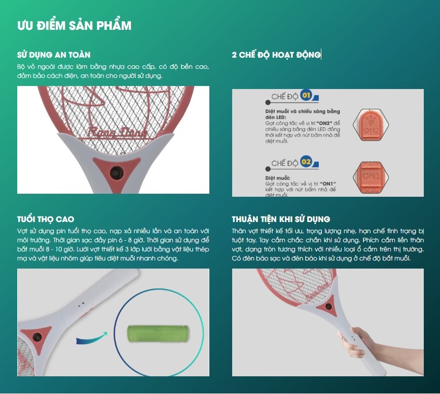 Đặc điểm nổi bật Lưới điện 3 lớp chống gỉ, diệt muỗi nhanh chóng chỉ trong tích tắc Pin sạc bền bỉ, không cần thay pin, tiết kiệm chi phí lâu dài Tích hợp đèn