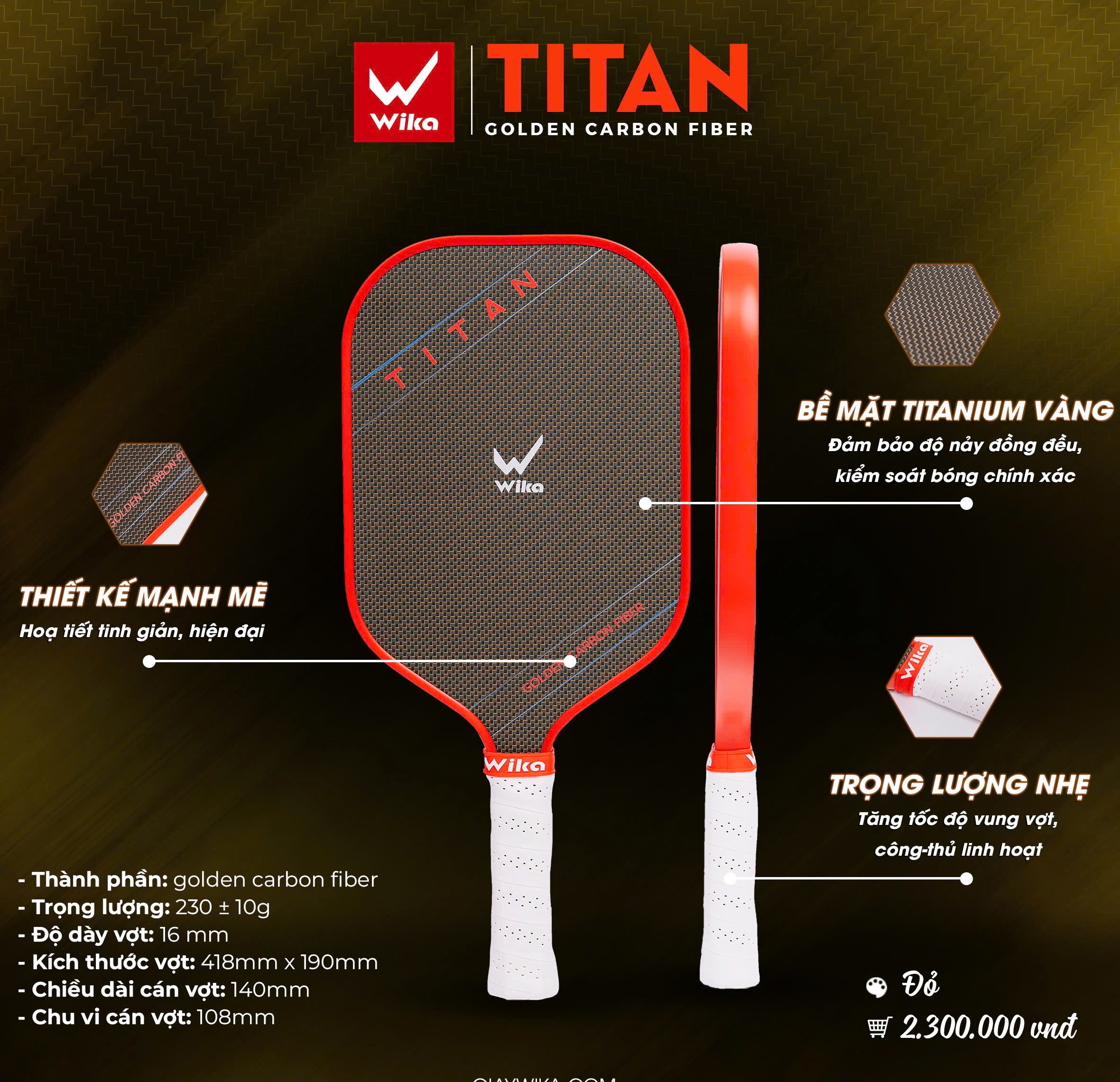 Lớp phủ Titanium Vàng trên Wi-ka Titan là công nghệ lý tưởng cho những người chơi tìm kiếm một cây vợt Pickleball hiệu suất cao và đầu tư vào trải nghiệm thi đấu chuyên nghiệp.
