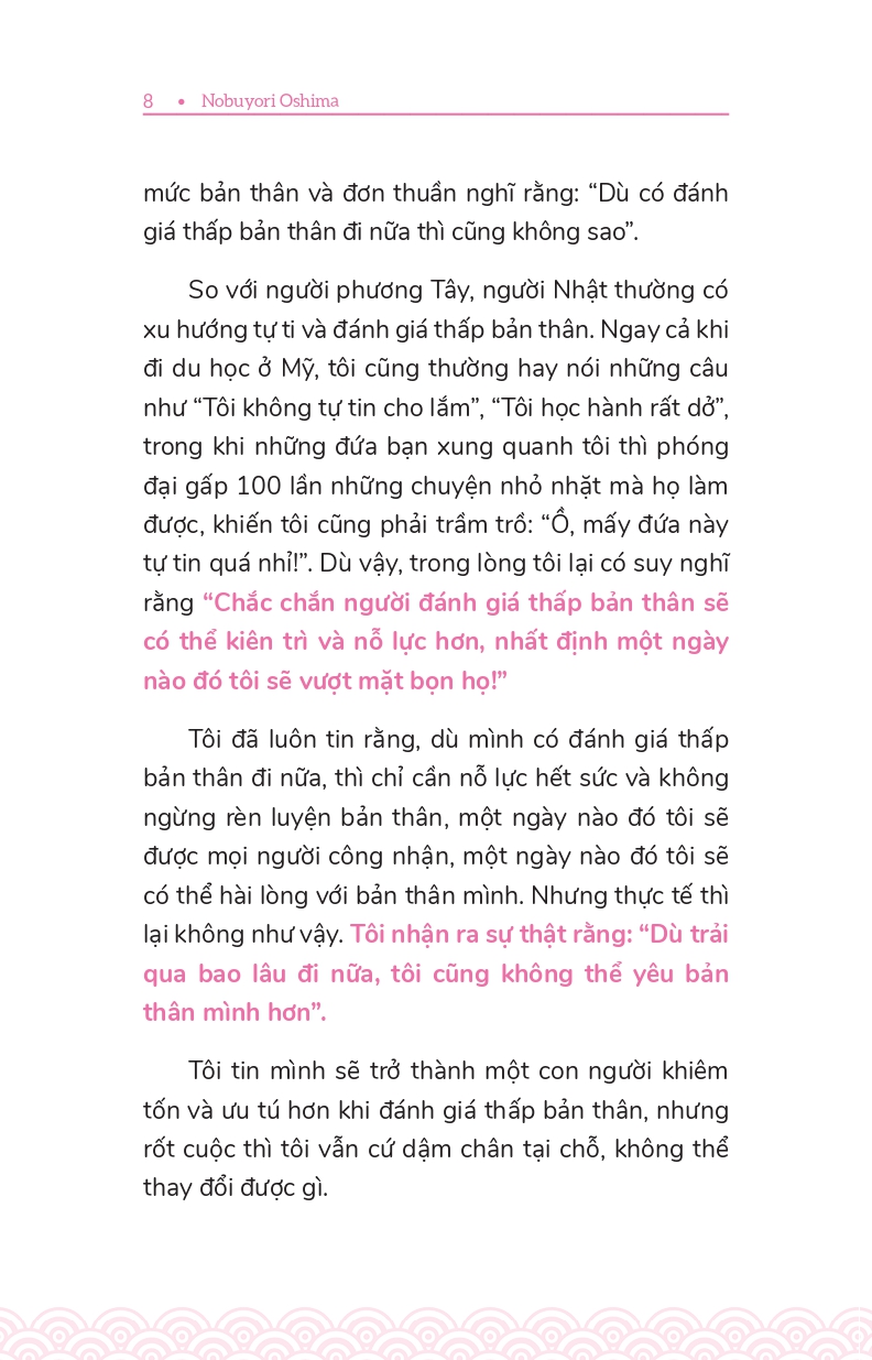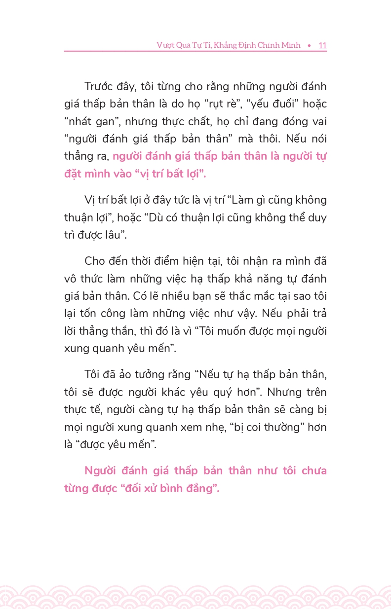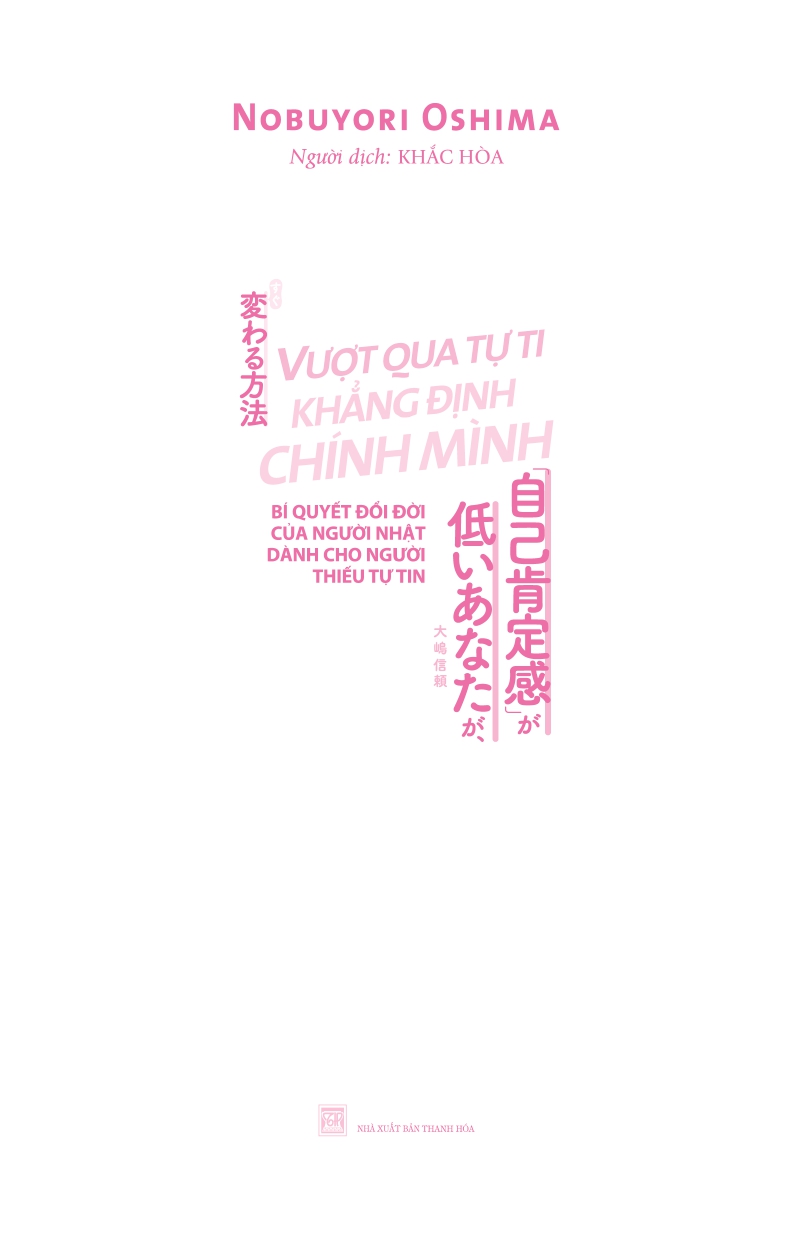 - Giới thiệu Vượt Qua Tự Ti - Khẳng Định Chính Mình Bất kể trong công việc hay cuộc sống, tự tin luôn là yếu tố hàng đầu dẫn dắt chúng ta tới thành công Thế nhưng, có không ít người lại có khuynh hướng đánh giá thấp bản thân, luôn tự chỉ trích chính mình, không ngừng bận tâm đến ánh mắt của người đời hoặc cố gắng tỏ ra khiêm tốn để được mọi người yêu mến. Bạn có đang rơi vào tình trạng tương tự như vậy không? Nếu có, VƯỢT QUA TỰ TI, KHẲNG ĐỊNH CHÍNH MÌNH là bí quyết giúp bạn thay đổi cuộc đời mình. Thông qua những hình ảnh minh họa sinh động, tác giả Nobuyori Oshima sẽ cung cấp nhiều phương pháp đơn giản mà hiệu quả nhằm giúp bạn từng bước nâng cao sự tự tin, biết cách đánh giá đúng mức bản thân và xây dựng cuộc sống mà bạn mong muốn.