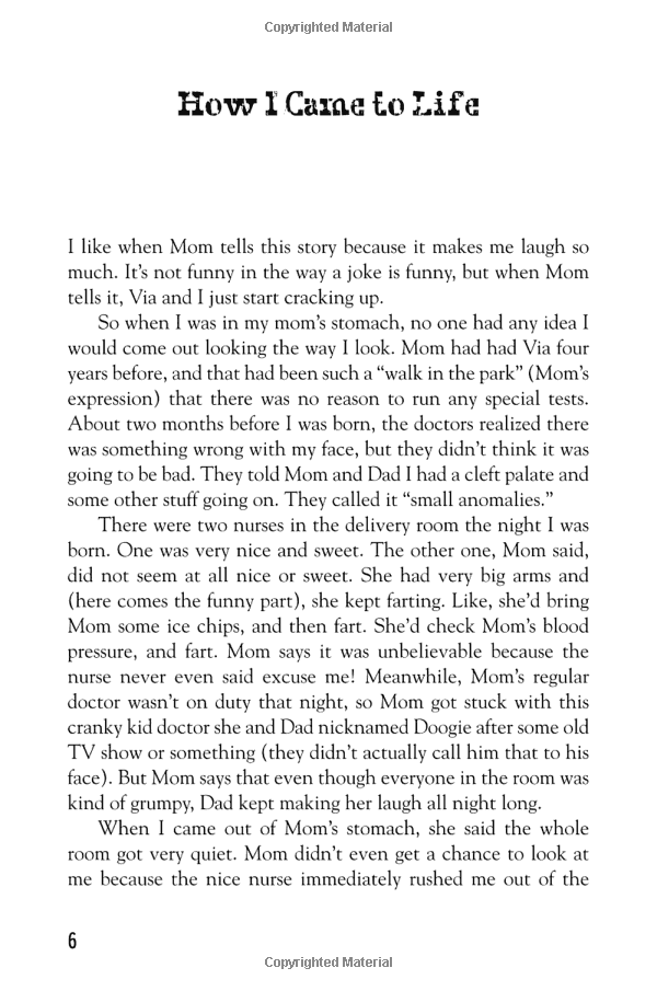 Auggie wants to be an ordinary ten-year-old. He does ordinary things - eating ice cream, playing on his Xbox. He feels ordinary - inside. But ordinary kids don't make other ordinary kids run away screaming in playgrounds. Ordinary kids aren't stared at wherever they go.