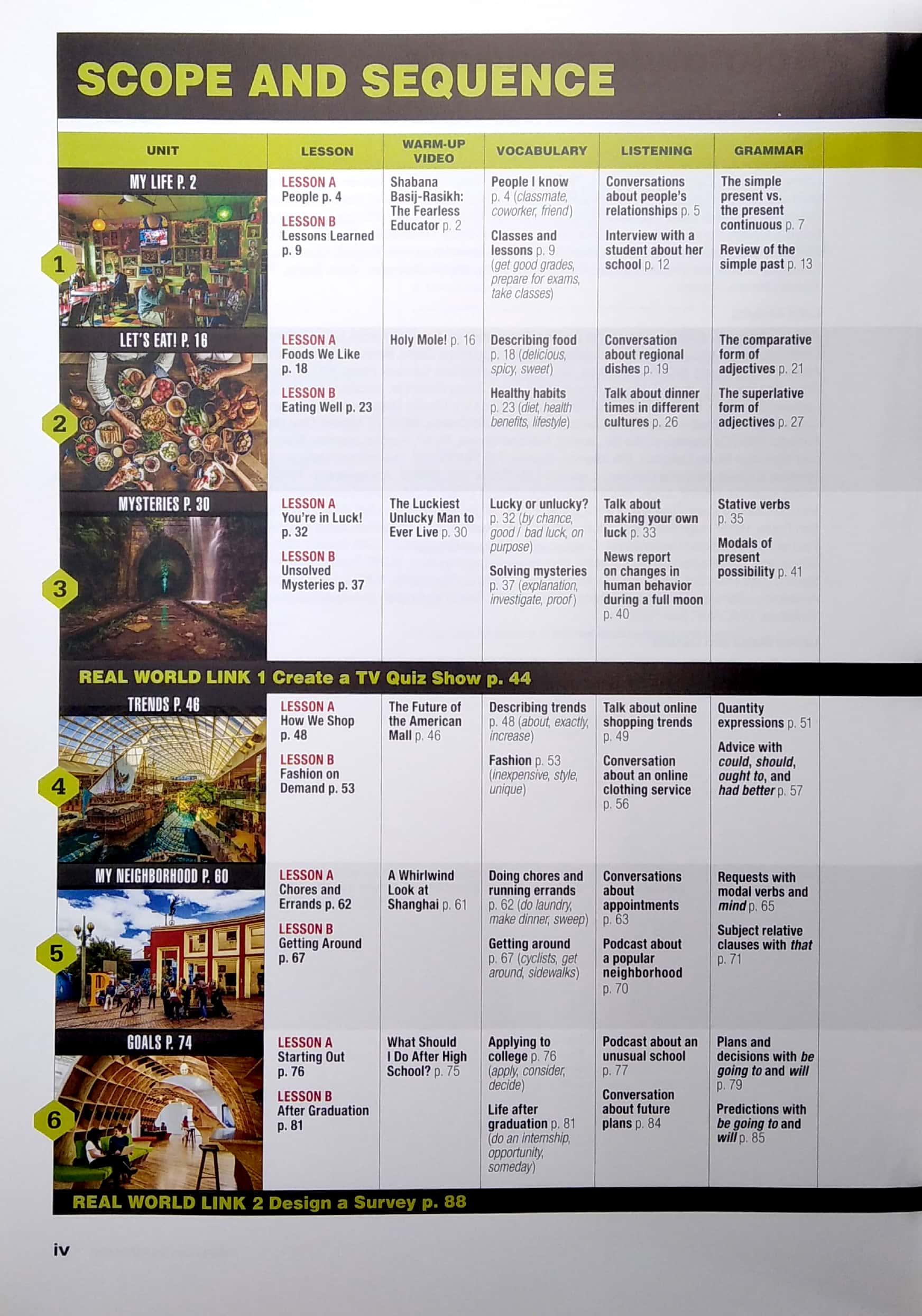 World Link, Fourth Edition teaches learners to communicate confidently. It develops integrated language skills with an emphasis on spoken English through familiar topics, relevant grammar, and essential vocabulary. World Link brings the world to the classroom through a famously fun video program, relatable National Geographic content, and teacher-tested lessons.