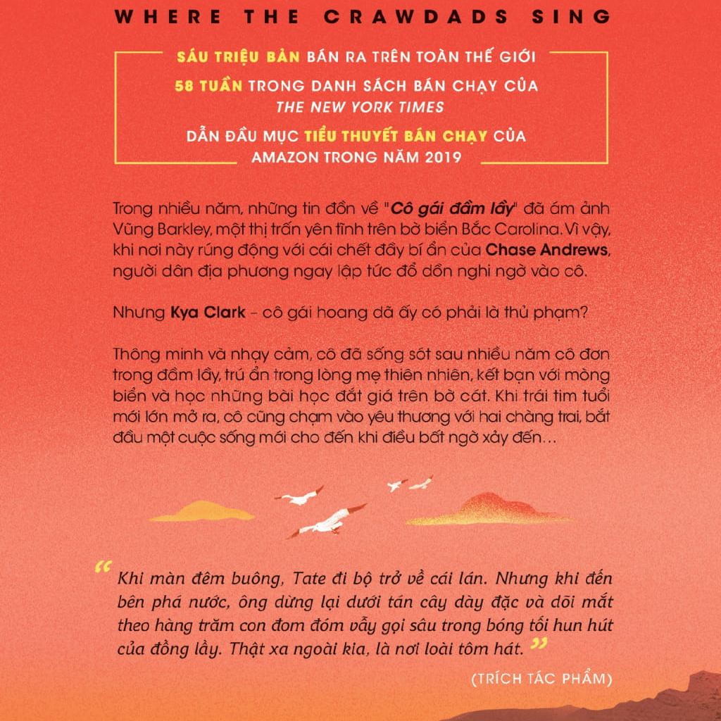 Thông minh và nhạy cảm, cô đã sống sót sau nhiều năm cô đơn trong đầm lầy, trú ẩn trong lòng mẹ thiên nhiên, kết bạn với mòng biển và học những bài học đắt giá trên bờ cát. Khi trái tim tuổi mới lớn mở ra, cô cũng chạm vào yêu thương với hai chàng trai, bắt đầu một cuộc sống mới cho đến khi điều bất ngờ xảy đến…