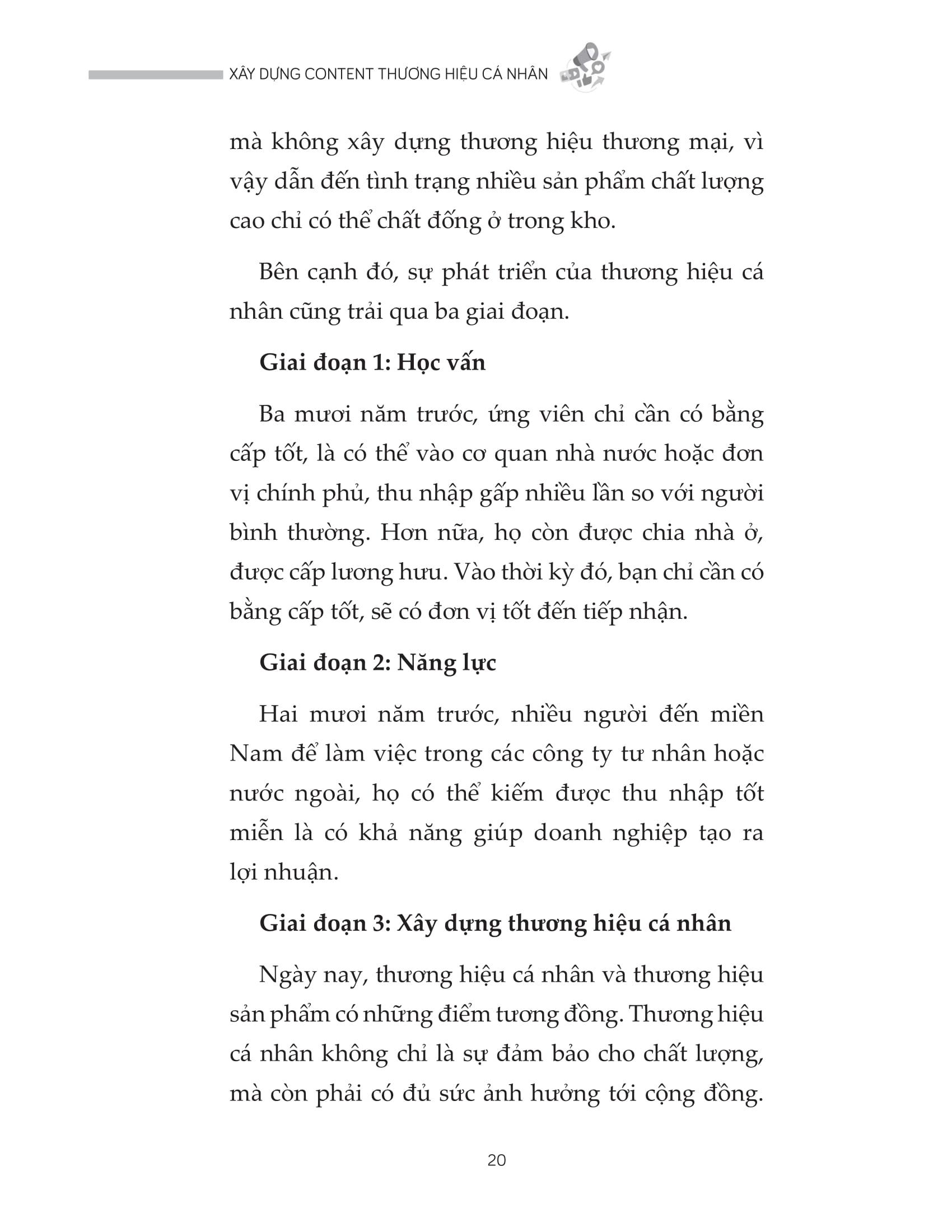 Cuốn sách được chia làm 8 chương sẽ giúp bạn đọc hiểu rõ về xây dựng thương hiệu cá nhân là cả một quá trình, và trong quá trình phát triển thương hiệu cá nhân sẽ giúp xác định đúng những thế mạnh, điểm yếu, kỹ năng,… của bản thân, để vận dụng những điều đó một cách hiệu quả hơn.