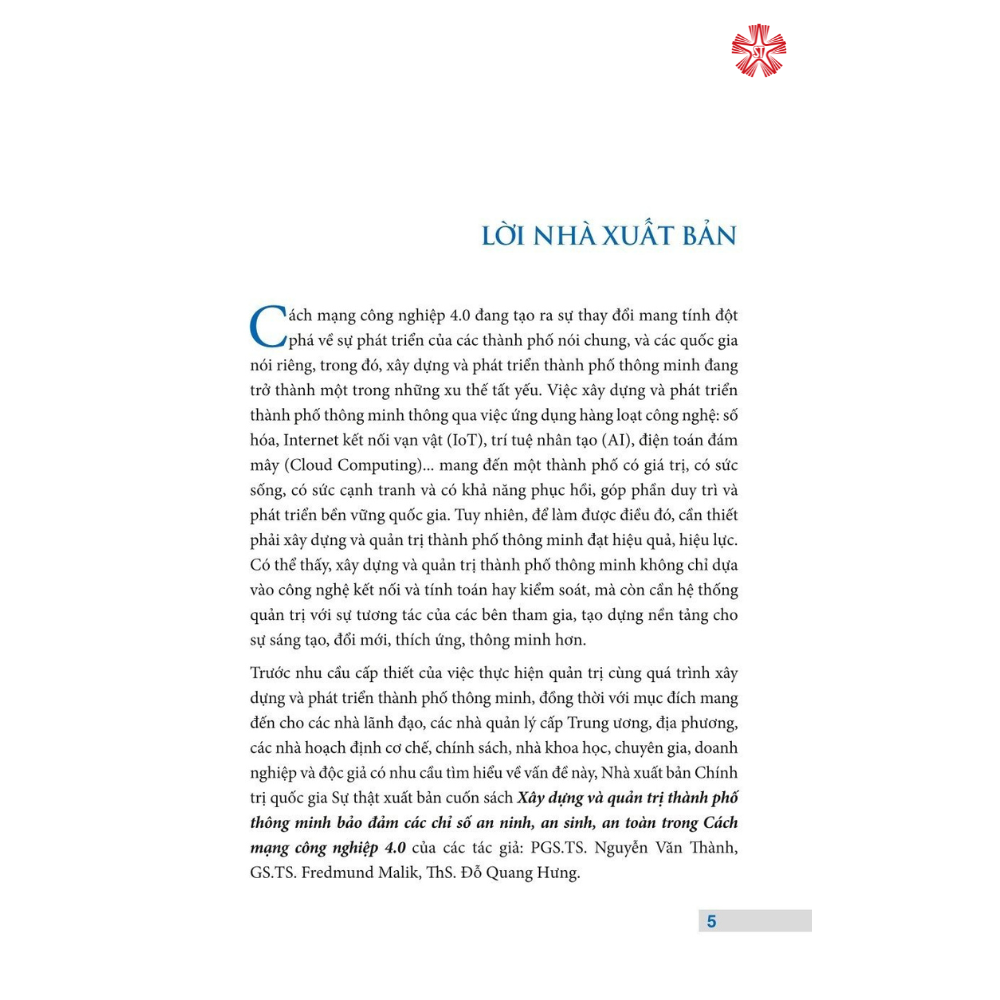 Cuốn sách đề cập kết quả nghiên cứu, khảo sát, đánh giá của các chuyên gia, các nhà khoa học trên thế giới về kết quả triển khai xây dựng thành phố thông minh cũng như các dự án tiêu biểu. Một số mô hình xây dựng thành phố thông minh tại Việt Nam được tác giả nghiên cứu, áp dụng trên thực tế cũng như được trình bày như ví dụ minh họa (thành phố Hải Phòng, thành phố Cần Thơ, tỉnh Bắc Ninh và tỉnh Lào Cai). Với cơ hội phát triển và thử nghiệm phương pháp tư duy hệ thống, phân tích SWOT, xây dựng và đưa vào áp dụng thực tiễn mô hình thành phố thông minh cho một số địa phương với những đặc trưng khác biệt như thành phố cảng - đô thị lớn, thành phố đồng bằng vùng trũng với lưu vực sông và chịu ảnh hưởng của biến đổi khí hậu và nước biển dâng, đô thị vùng trung du - vùng thủ đô,…, cuốn sách góp phần định hướng và xác lập phương pháp tiếp cận để các thành phố, đô thị có được phương hướng rõ hơn trong lộ trình đầu tư xây dựng và phát triển thành phố thông minh phục vụ cộng đồng.