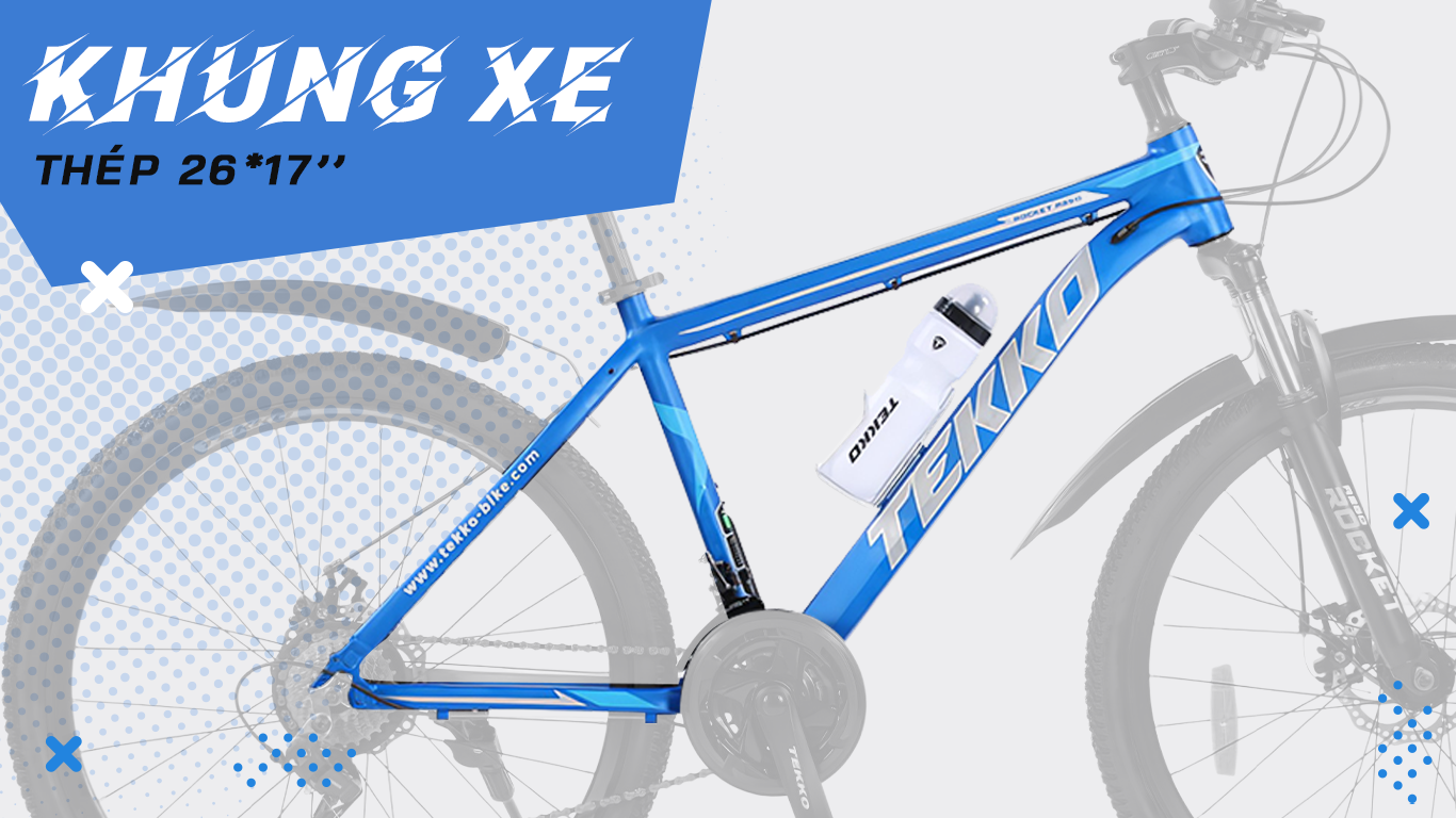 Thông Số Kỹ Thuật: Khung xe : thép 26 x17 Phuộc : Giảm sóc với khóa 26 x 205 mm Ghi đông : tay lái thẳng - thép 31,8 x 28,6 x620 mm Cân nặng