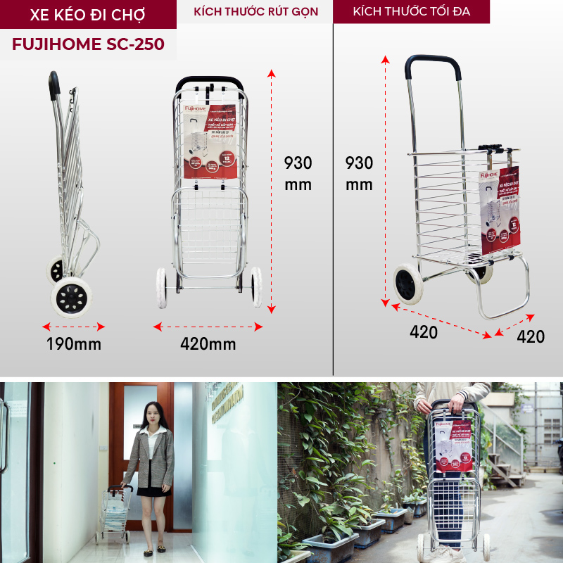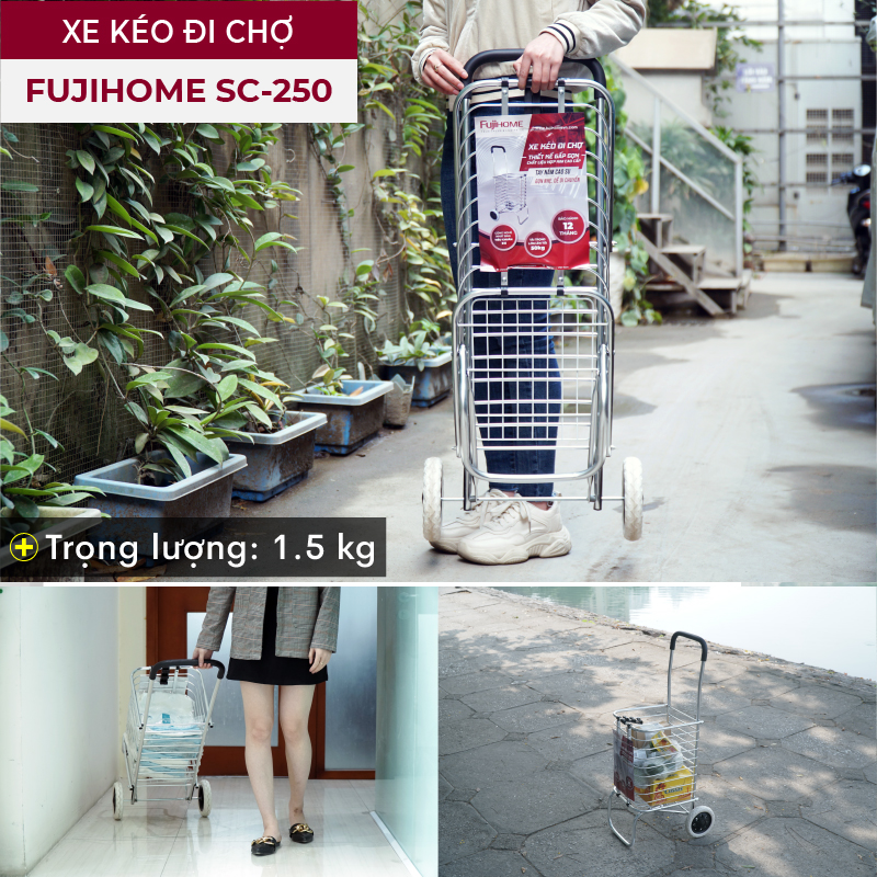 - Xe kéo đi chợ đa năng FUJIHOME SC-250 có trọng lượng nhẹ chỉ 2.2 kg và có thể gấp gọn lại khi không sử dụng nên rất tiện lợi.