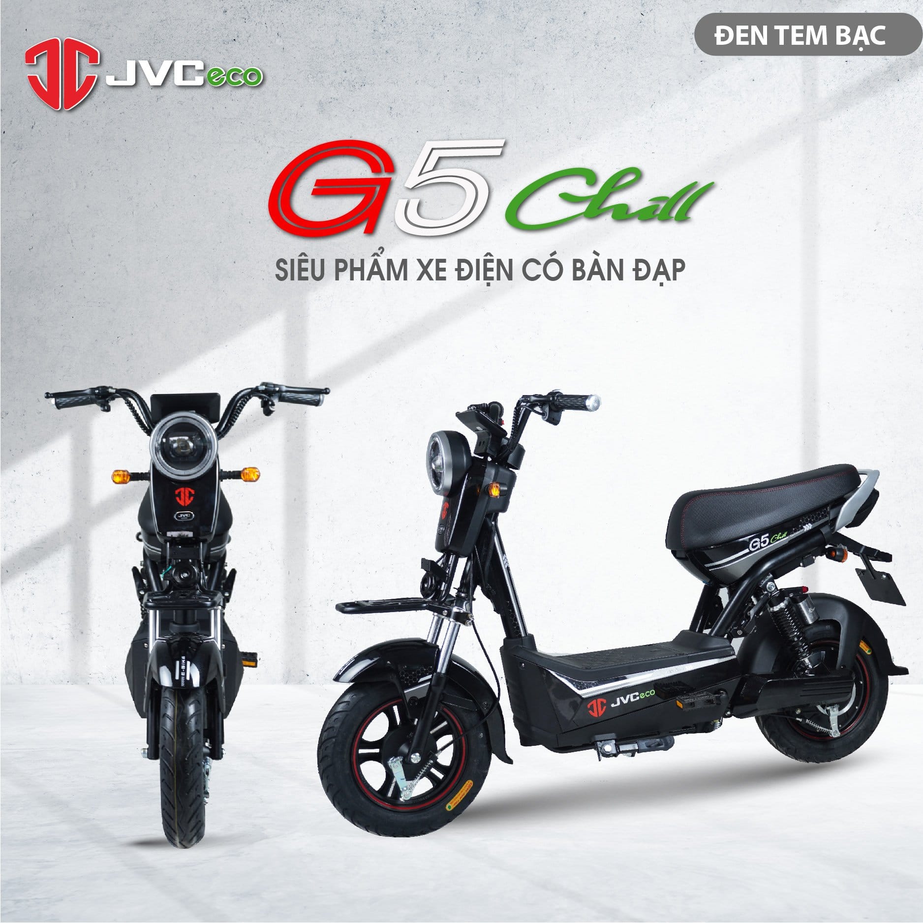 JVC G5 CHILL XE ĐIỆN CÓ BÀN ĐẠP ️ JVC G5 CHILL được thiết kế theo phong cách HIỆN ĐẠI, TINH TẾ mang tới sự tự tin cho người lái ƯU ĐIỂM NỔI BẬT CỦA JVC G5 CHILL Bàn đạp trợ lực hỗ trợ hành trình di chuyển Bộ tem mới thiết kế THỜI TRANG Đèn pha dạng tròn góc sáng rộng hơn Tay ga, công tắc, tay phanh cao cấp đến từ thương hiệu Wuxing Đồng hồ dẹt hiển thị thông minh Yên xe êm ái in dấu ấn logo JVC Động cơ mới kết hợp với bộ điều khiển không dây Ắc quy được bổ sung thanh giằng bình chắc chắn tuyệt đối, tháo lắp dễ dàng hơn Vành trước nhập khẩu có thiết kế riêng biệt đồng bộ với động cơ Giam xóc sau nâng cấp chất lượng, bảo hành 12 tháng Động cơ và khung xe bảo hành 36 tháng Bình ắc quy bảo hành 18 tháng