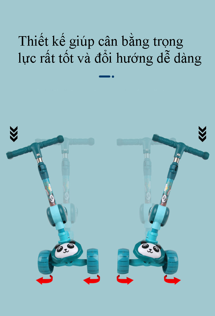 Ưu điểm nổi bật - Xe ba bánh có phát sáng, không sử dụng Pin, - Chốt gập cần xe lên xuống dễ dàng bằng 1 thao tác. - Xe có 5 nấc chỉnh độ