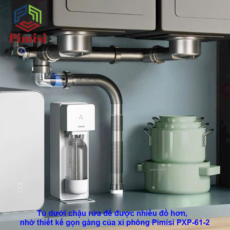 - Thiết Kế Tinh Gọn – Tối Ưu Hóa Không Gian Tủ Bếp: Hiểu được tầm quan trọng của không gian trong căn bếp hiện đại, Pimisi đã thiết kế xi phông thoát nước chậu rửa bát PXP-61-2 với kiểu dáng tối giản, các chi tiết được bố trí khoa học, giúp tiết kiệm tối đa diện tích bên dưới bồn rửa chén 2 hố. Giờ đây, bạn có thể tận dụng không gian này để sắp xếp các vật dụng nhà bếp một cách gọn gàng và tiện lợi.