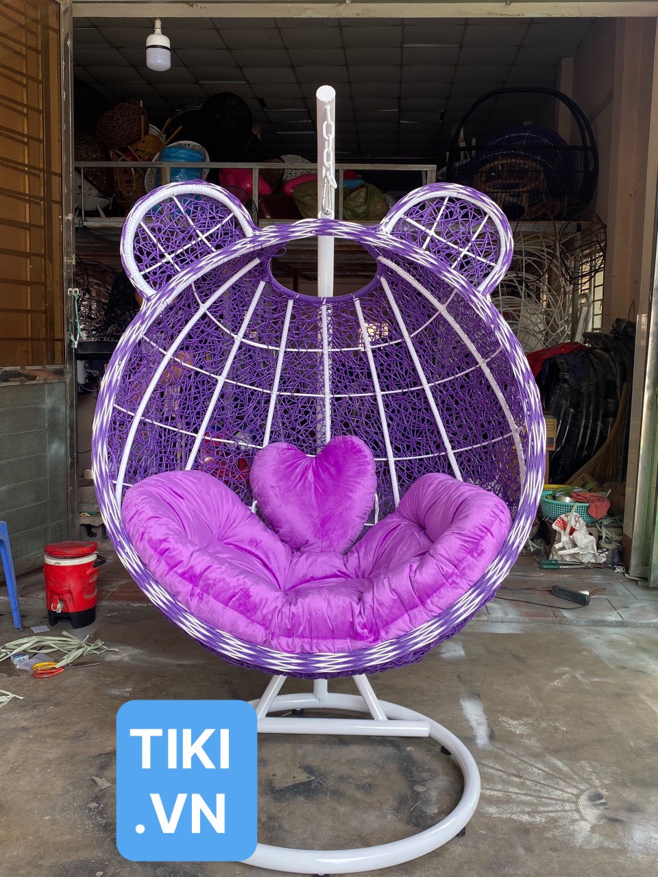 Bộ sản phẩm gồm : + Bộ nệm và 02 gối hình trái tim màu hồng + Thân lồng xích đu được sơn tĩnh điện và được đan nhựa giả mây màu hồng như hình