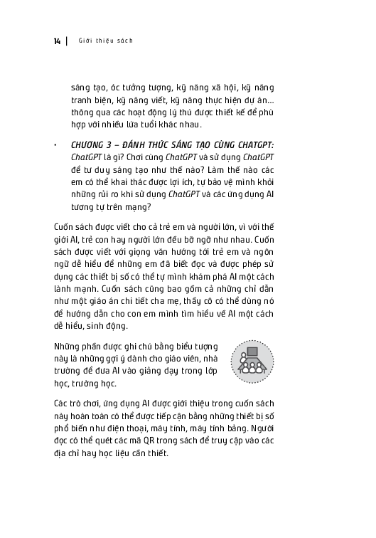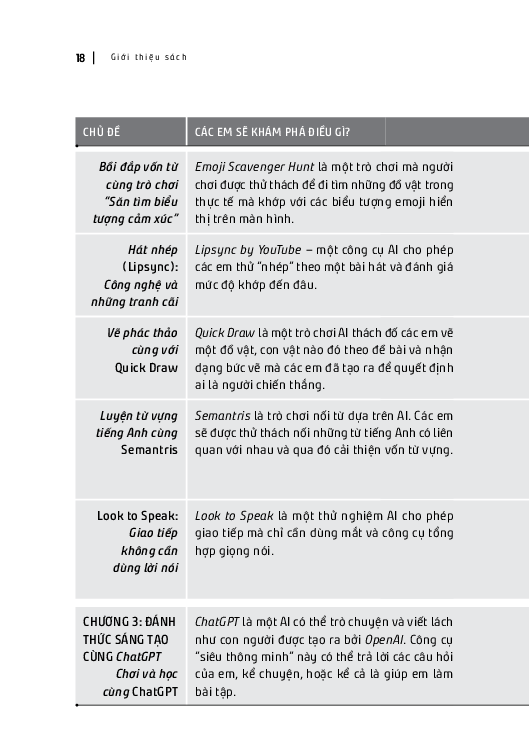 Làm thế nào để trẻ em hiểu về AI và các ứng dụng của AI trong thế giới hiện tại và tương lai trở thành một vấn đề cấp thiết. Nhưng, học về AI không “kỹ thuật”, “khô khan” như nhiều người vẫn nghĩ. Cuốn sách này được viết để mang AI đến gần với các em thông qua những trò chơi và hoạt động trải nghiệm vui nhộn, giàu cảm hứng, kết nối một cách thân thuộc với cuộc sống và việc học hàng ngày của các em.