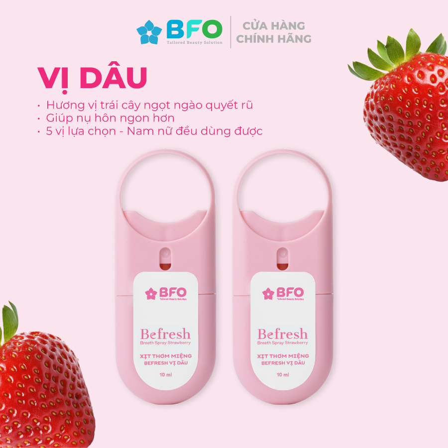 BFO là Chuỗi Cửa hàng làm đẹp & chăm sóc sức khỏe với sứ mệnh đem đến những sản phẩm mỹ phẩm lành tính, hài hòa công năng “Làm Sạch và Làm Đẹp” cùng với chất lượng và dịch vụ luôn đảm bảo nhằm nâng cao hình ảnh thương hiệu mỹ phẩm Việt đến với khách hàng. Tại BFO, rất nhiều dòng sản phẩm làm đẹp - chăm sóc sức khoẻ được ra đời. Trong đó, sản phẩm Xịt thơm miệng Befresh chính là một trong những điều “tuyệt vời” mà bạn không nên bỏ qua: