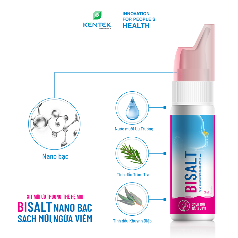 Xịt vệ sinh mũi ưu trương, dưỡng xoang dành cho trẻ em BISALT NANO BẠC | Kentek Pharma | Chai 75mlXịt vệ sinh mũi ưu trương, dưỡng xoang dành cho trẻ em BISALT NANO BẠC | Kentek Pharma | Chai 75mlXịt vệ sinh mũi ưu trương, dưỡng xoang dành cho trẻ em BISALT NANO BẠC | Kentek Pharma | Chai 75ml