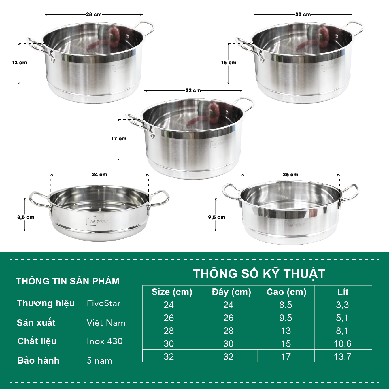 - Sản phẩm phù hợp dùng cho các #noiinoxfivestar: +Xửng #fivestar 24cm dùng cho #noifivestar 24cm +Xửng #fivestar 26cm dùng cho #noifivestar 26cm +Xửng #fivestar 28cm dùng cho #noifivestar 28cm +Xửng #fivestar 30cm dùng cho #noifivestar 30cm