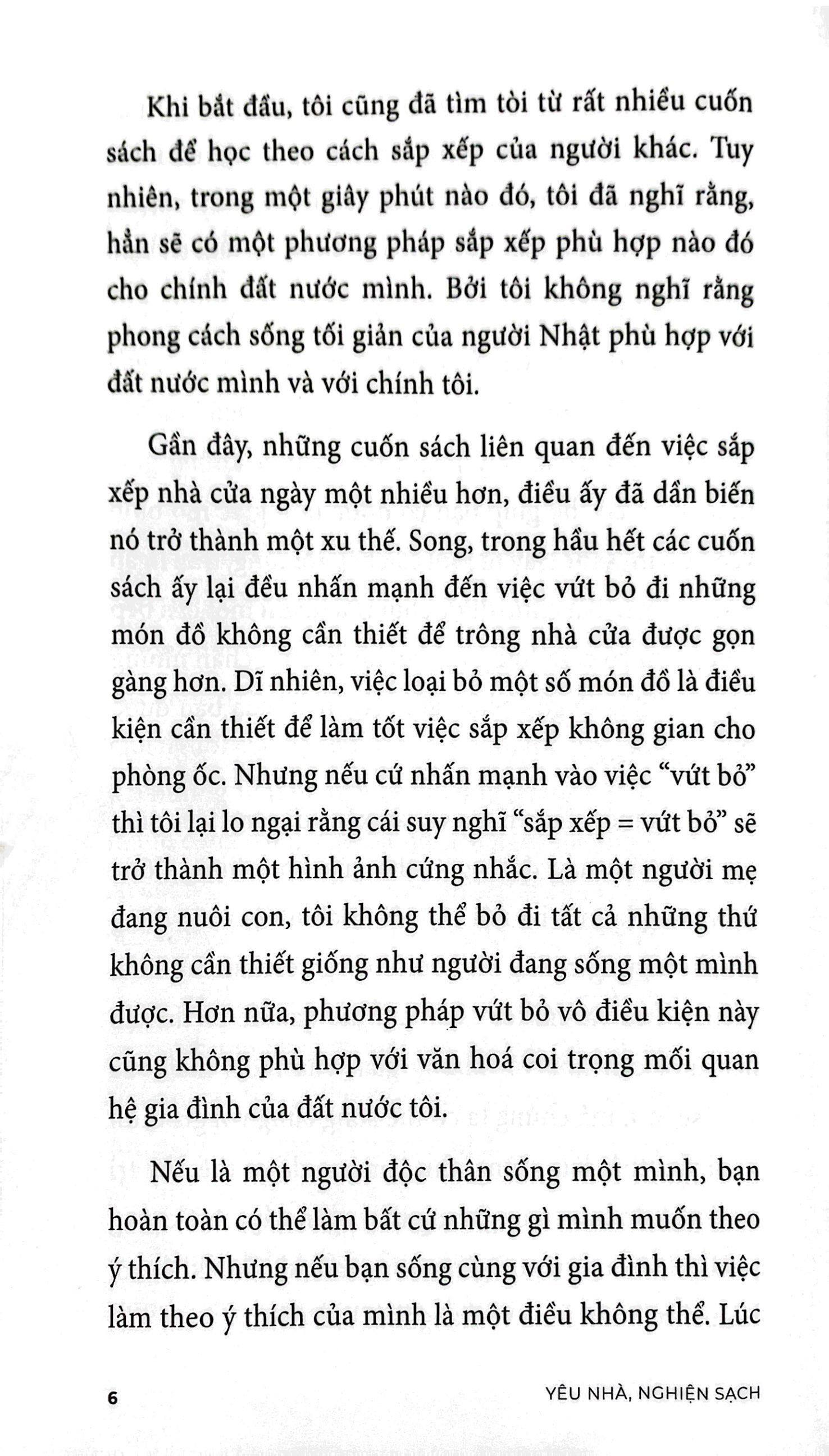 Gần gũi và dễ ứng dụng, “Yêu nhà, nghiện sạch” sẽ giúp bạn nâng cấp trải nghiệm về không gian sống, biến những nơi chật hẹp trở nên rộng rãi chỉ thông qua việc sắp xếp. Không chỉ vậy, tác giả còn gửi gắm thông điệp: “Hạnh phúc không thể đo bằng những gì chúng ta sở hữu. Hạnh phúc được tạo ra trong chính căn nhà của m.ình, khi chúng ta biết cách sắp xếp mọi thứ.”