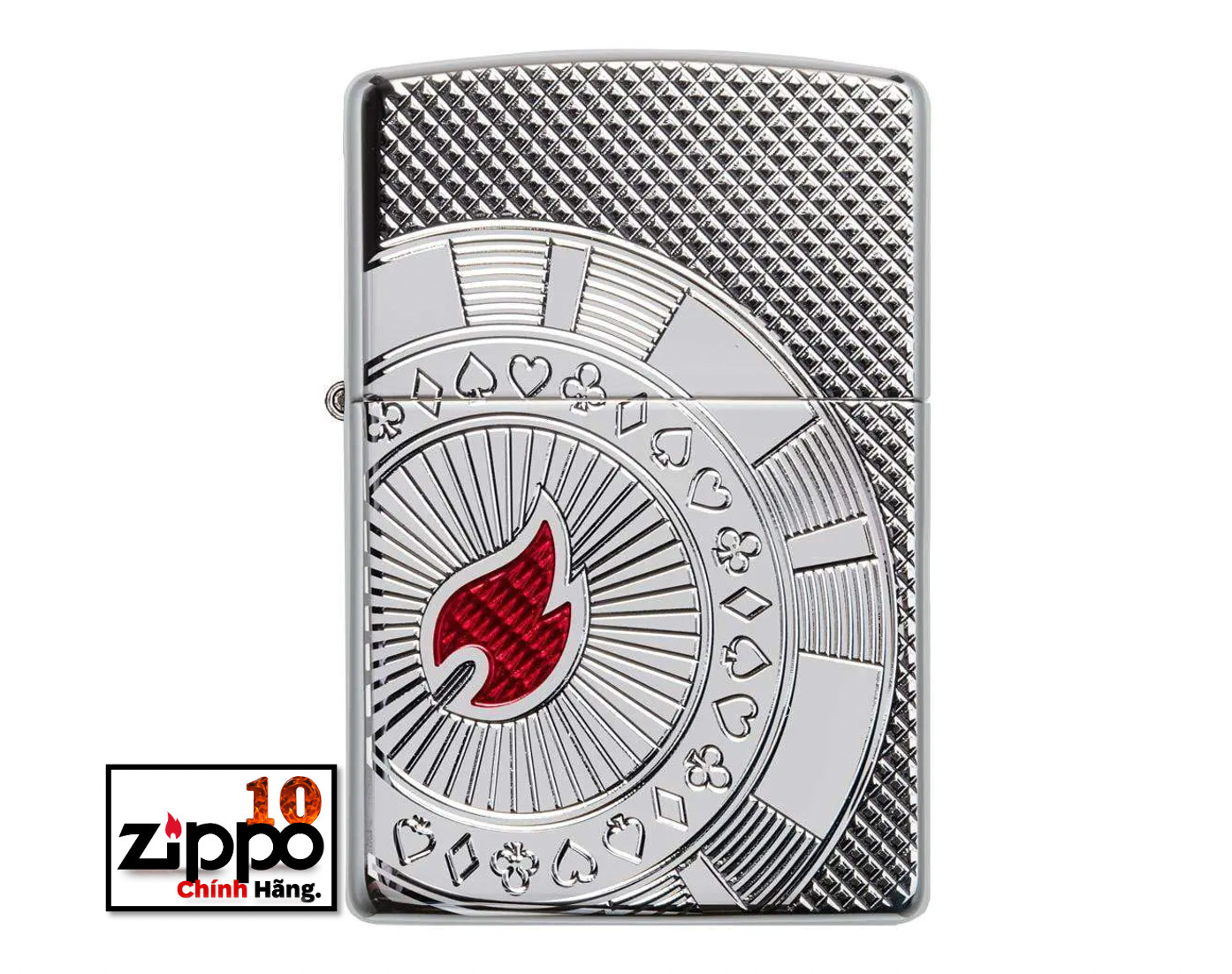 Đây Armor Polish Chrome hiển thị sáng hơn một thiết kế chip poker thanh lịch. Chip poker được tạo ra bằng cách sử dụng quy trình khắc sâu trong khi ngọn lửa Zippo tập trung vào chip mang lại màu đỏ cho thiết kế bằng quy trình inlay epoxy. Được đóng gói trong một hộp đựng dạng quà tặng. Để tối ưu hiệu suất, hãy dùng nhiên liệu bật lửa của Zippo.